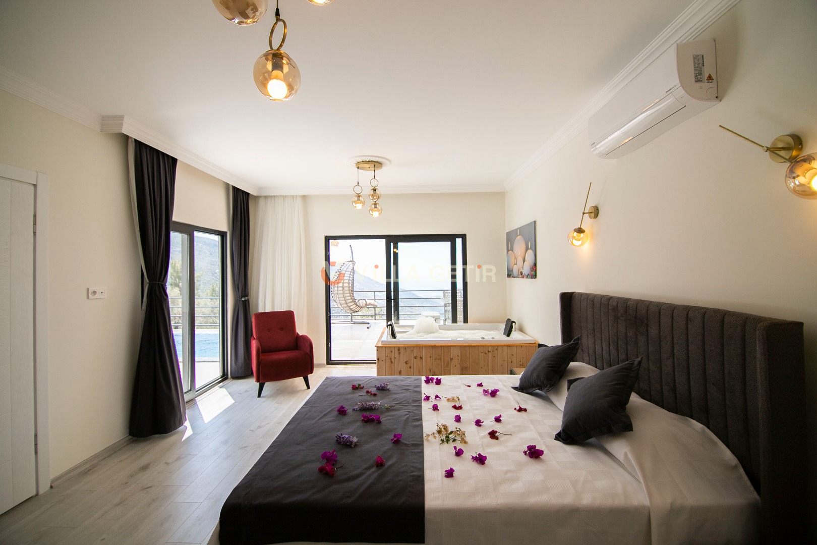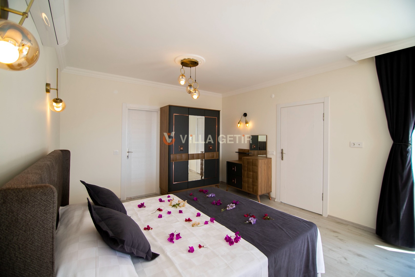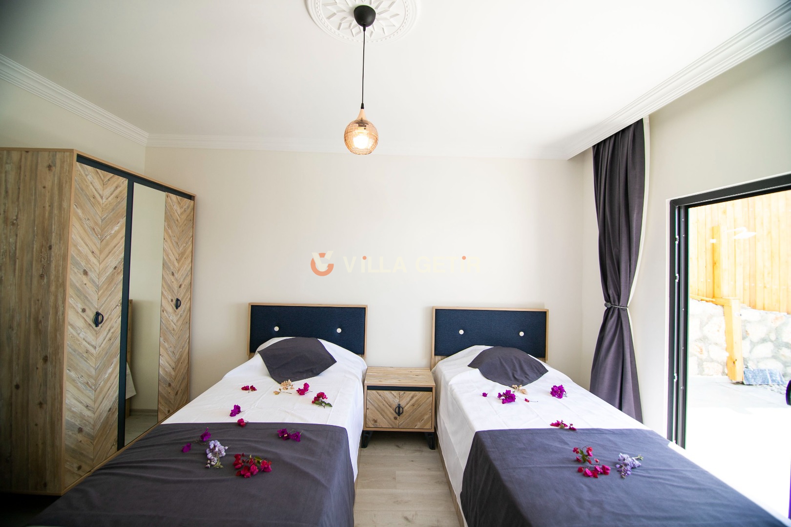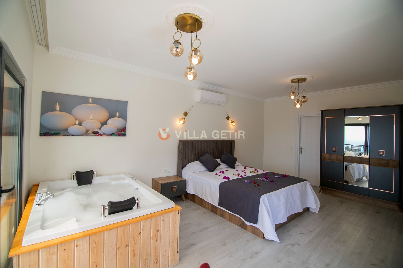Villamızın içerisinde iki adet yatak odası ve iki adet banyo bulunmaktadır. Birinci yatak odasında çift kişilik yatak, klima, banyo ve jakuzi bulunmaktadır. İkinci yatak odasında iki adet tek kişilik yatak, klima ve banyo bulunmaktadır. Salon kısmında mutfak, klima ve televizyon bulunmaktadır.