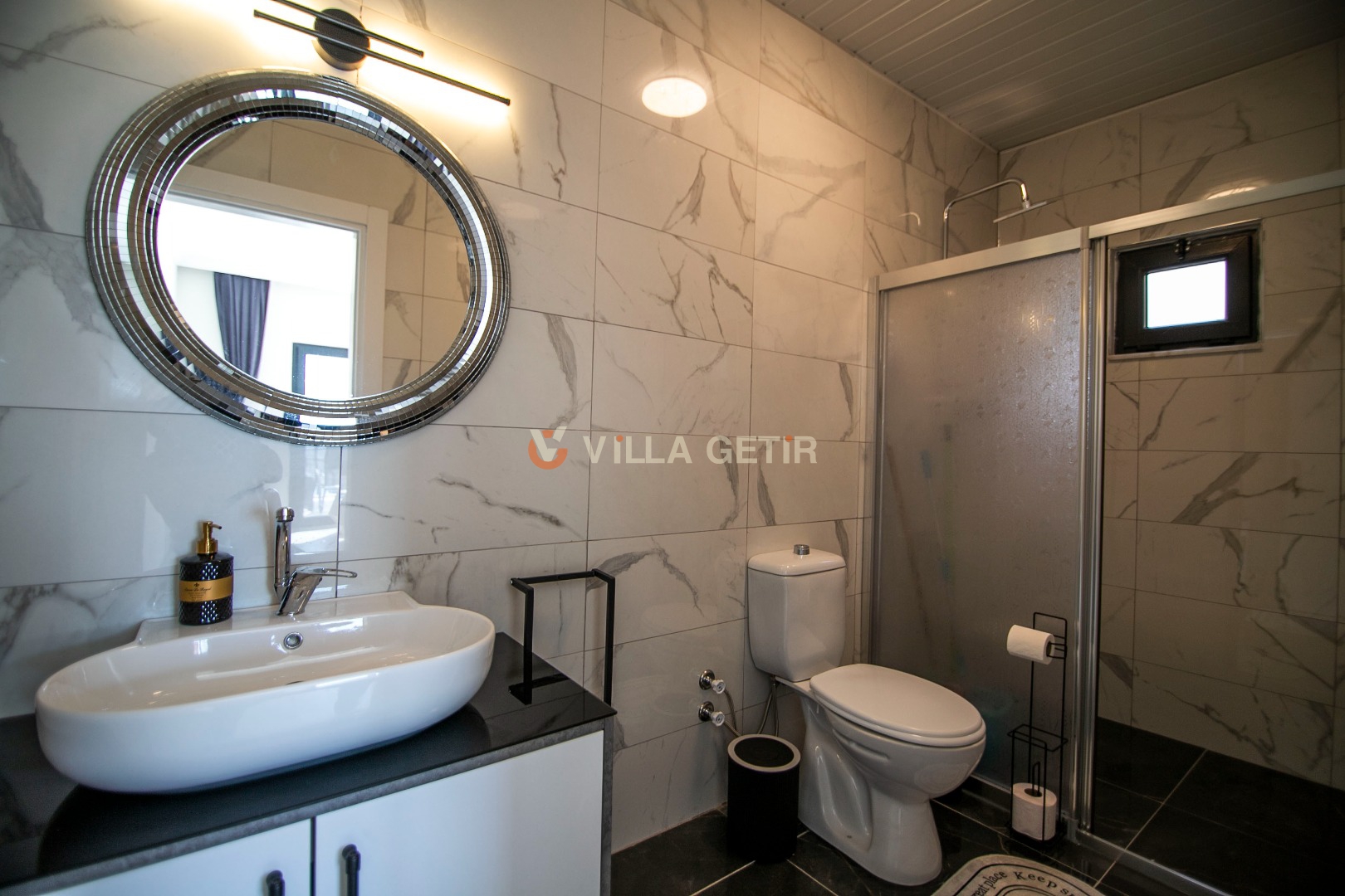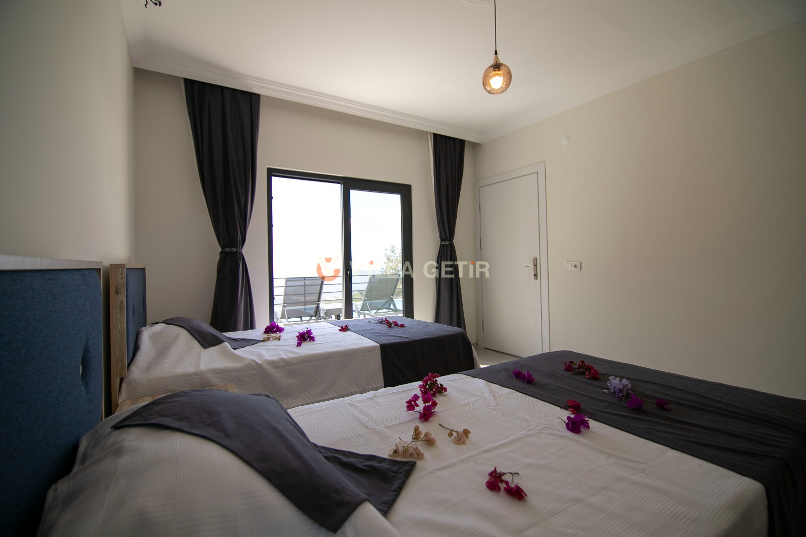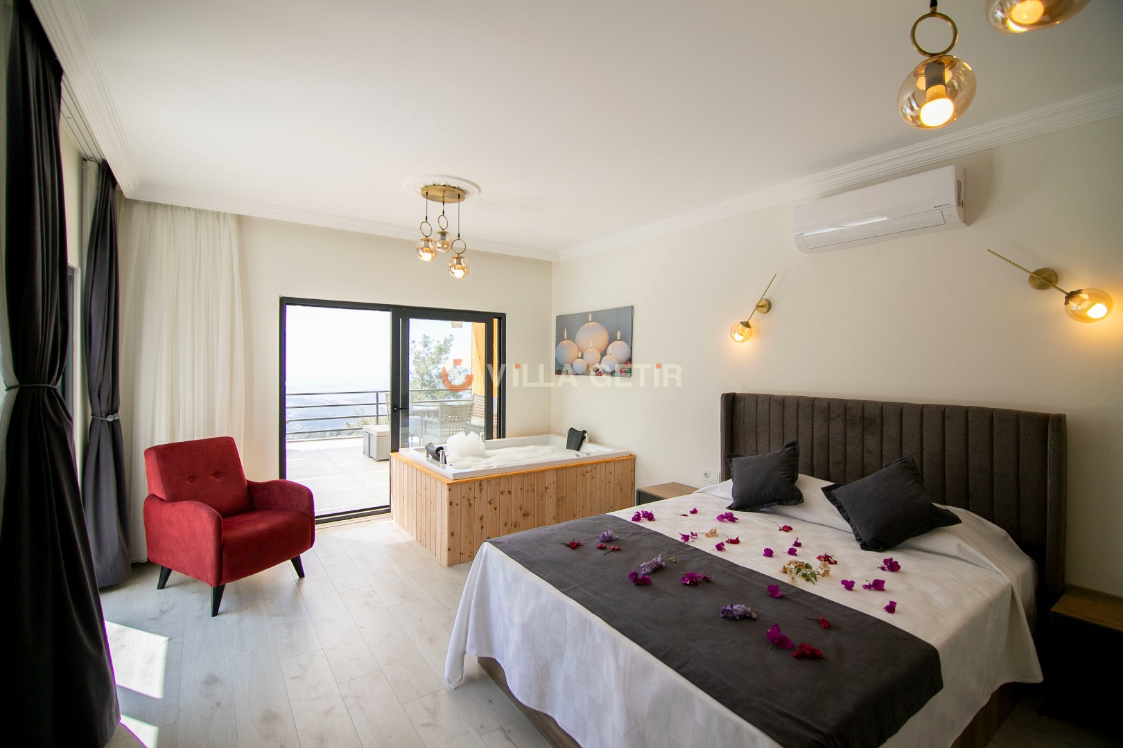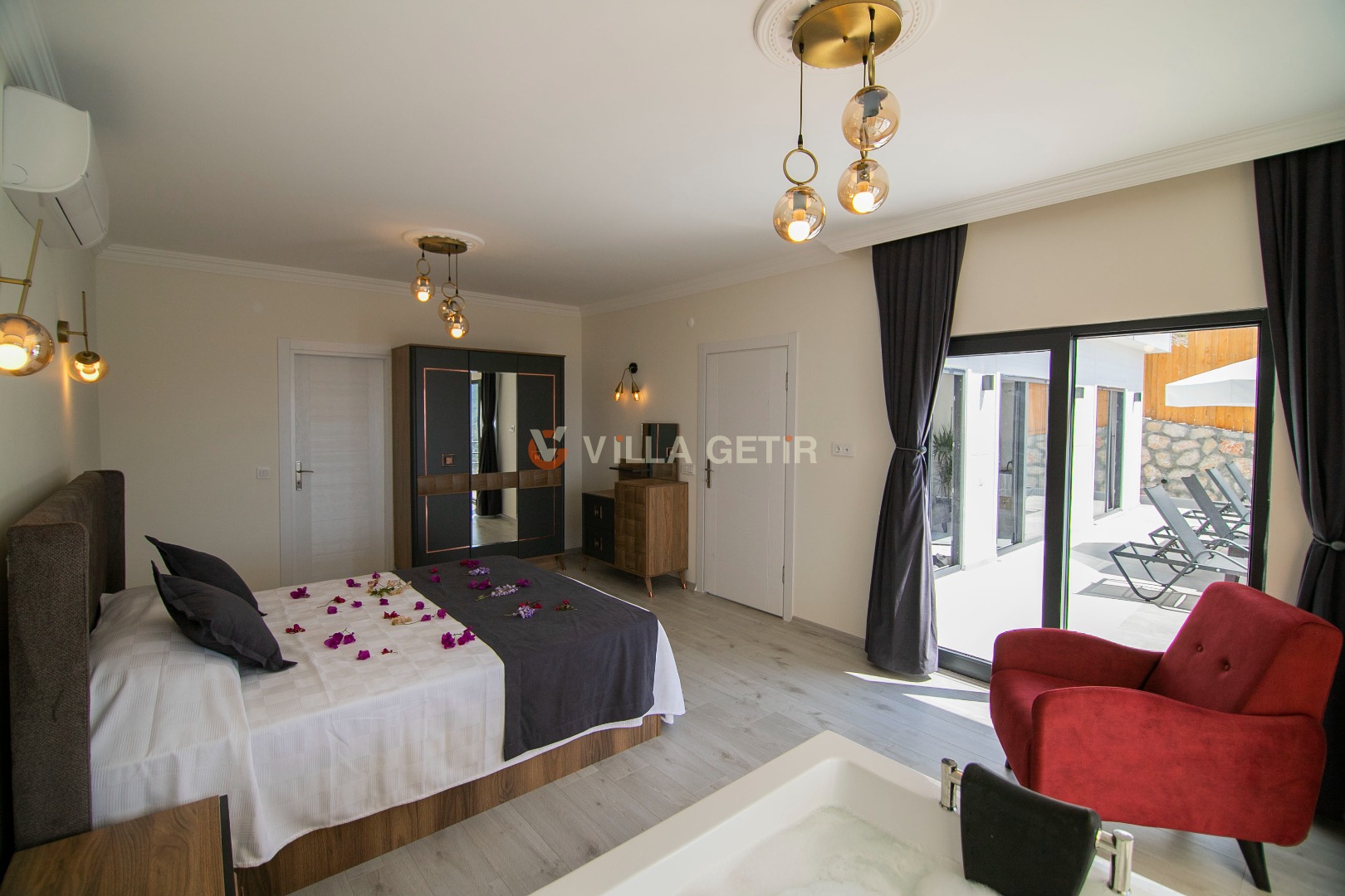 Villamızın içerisinde iki adet yatak odası ve iki adet banyo bulunmaktadır. Birinci yatak odasında çift kişilik yatak, klima, banyo ve jakuzi bulunmaktadır. İkinci yatak odasında iki adet tek kişilik yatak, klima ve banyo bulunmaktadır. Salon kısmında mutfak, klima ve televizyon bulunmaktadır.