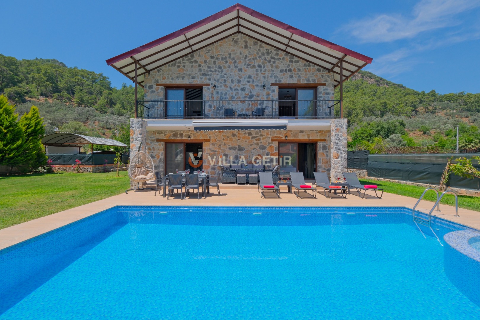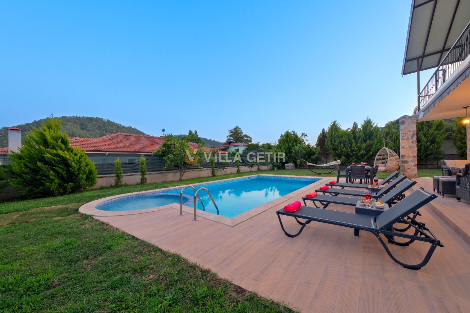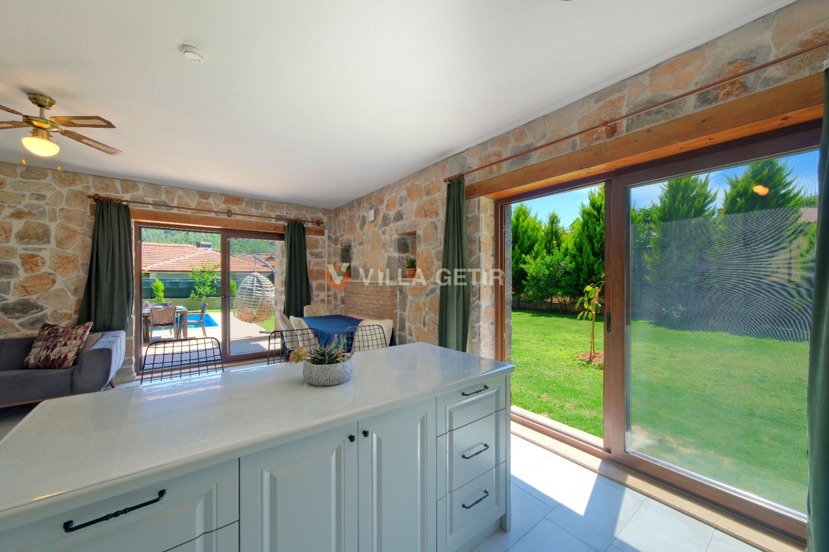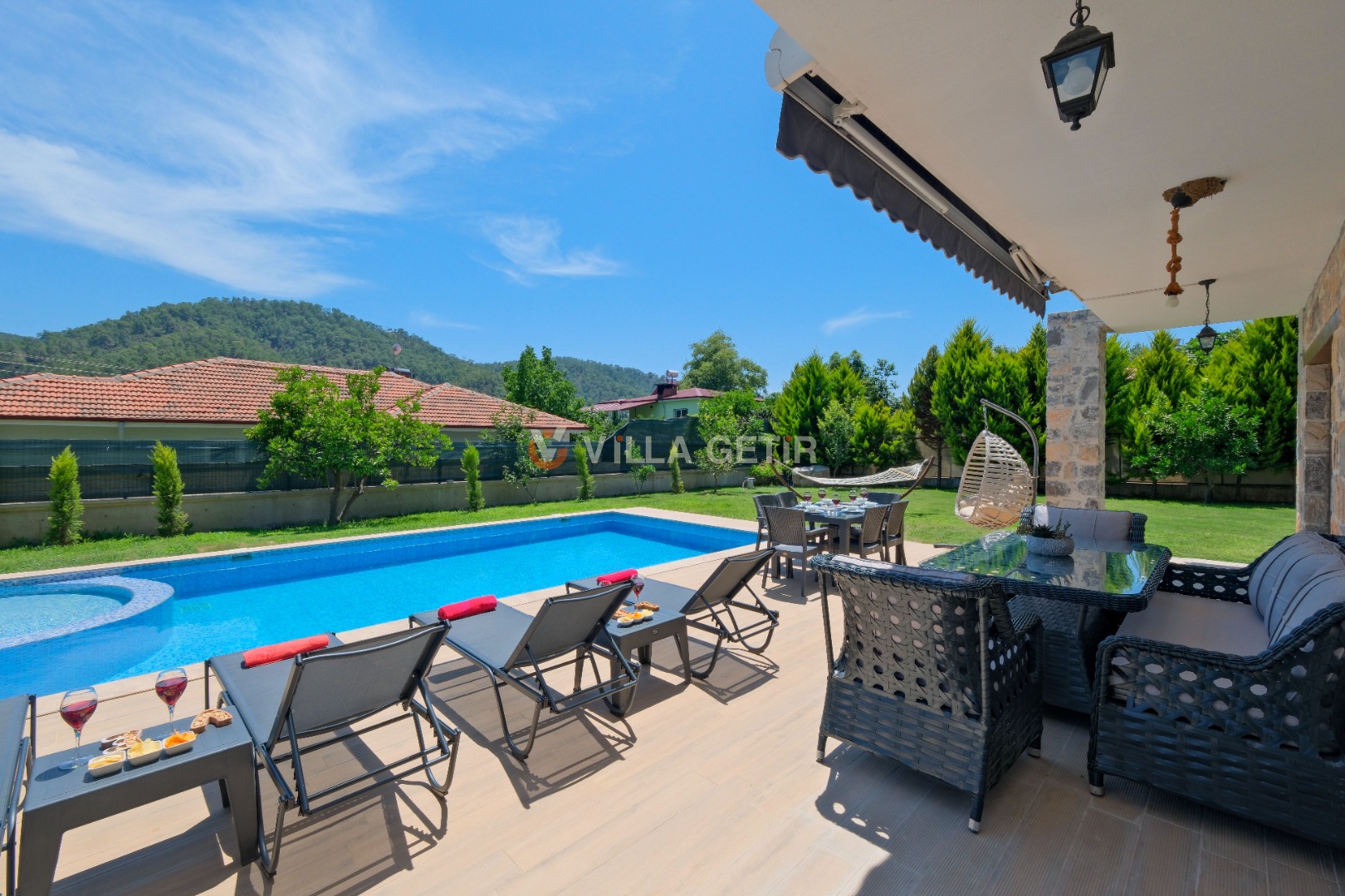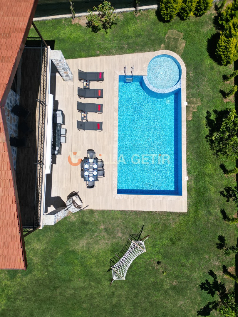 Kısmi korunaklı yemyeşil bahçe ve havuz alanında yer alan konforlu oturma grupları, kapasiteye uygun şezlong takımları ve salıncağı konumlandırılan villamızın iç mekanı da dış mekanı kadar konforlu ve ferah bir yaşam alanı sunmaktadır.